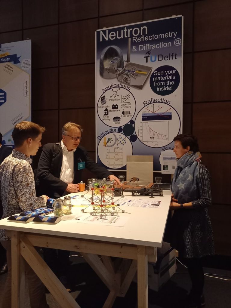 Today we presented our neutron reflectometry and diffraction beamline at the Materialen NL conference (‘Materials NL’) in Arnhem. These experimental techniques can be used to characterise materials. Diffraction to unreval the crystal structure of materials at the nm range, and neutron reflectometry to study the thicknesses, composition and roughness of thin layered films on the 2-200 nm scale. Amy Navarathna and Michel Thijs illustrated the potential of these experimental techniques using a poster and scaled models of the beamlines. We thank all enthusiast visitors of our booth fro there curiosity in our work and the possibility to use our set-ups.