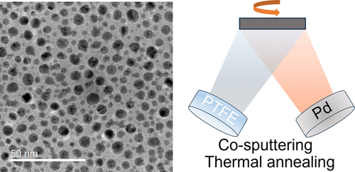 In our latest publication, we show how free-standing palladium nanoparticles with a size of about 5 nm embedded in a fluorinated polymer matrix can be synthesized using magnetron codeposition and a subsequent annealing step. Indeed, we deposit with magnetron sputtering at the same time PTFE and Pd, and a subsequent thermal annealing step under a hydrogen atmosphere ensures agglomeration of the Pd atoms into small nanoparticles. This scalable vapor-based method allows deposition on all kinds of surfaces, including substrates and optical fibers. Using a combination of transmission electron microscopy, grazing-incidence diffraction, neutron and X-ray reflectometry, and X-ray photoelectron spectroscopy, we characterize the nanocomposite films and the palladium particles inside. These palladium nanoparticles could have a variety of applications in catalysis, hydrogen compressors, and optical hydrogen sensors. For the later application, we show using optical transmission measurements that the nanoparticles can reversibly absorb hydrogen, having well-defined steps in optical transmission when the hydrogen pressure is changed. Owing to their small size, the polymer matrix, and high surface-to-volume ratio, the nanoparticles show subsecond response times to changes in hydrogen concentration.