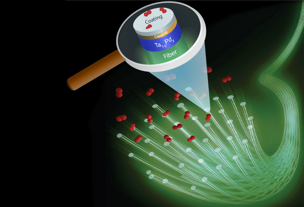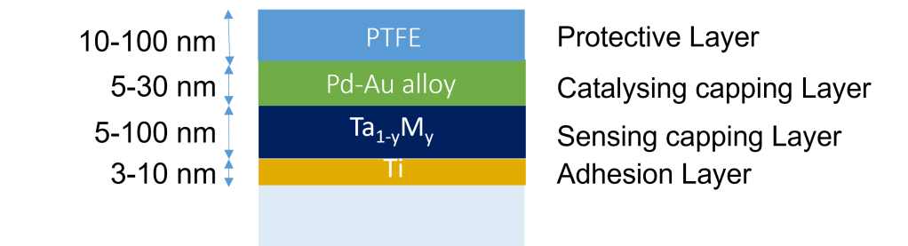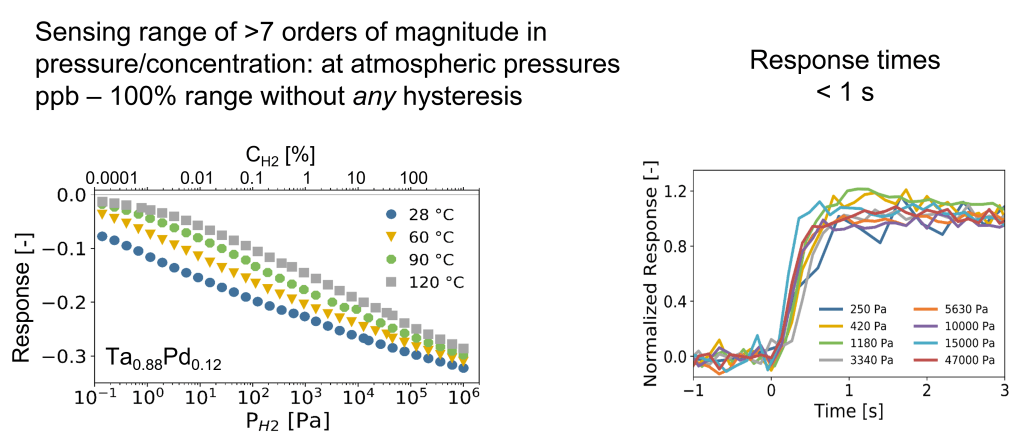One example of a hydrogen sensing material is the tantalum-based optical hydrogen sensor developed and patented by TU Delft have, measured in an environment of hydrogen with an inert gas, a sub-second response that is completely free of any hysteresis across over 7 orders of magnitude in partial hydrogen pressure/concentration. This material is combined with a thin (5-30 nm) layer of a Pd-Au alloy to protect it against oxidation. Most importantly, this layer also catalyses the hydrogen dissociation reaction: in the environment, hydrogen is a diatomic molecule (H2), while in the material the hydrogen are individual atoms. The Pd-Au catalytic layer catalyses the dissociation of molecular in atomic hydrogen.