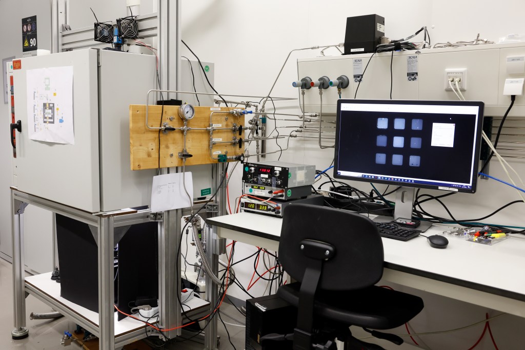 In hydrogenography, we monitor the optical transmission of one or more thin films over time while exposing it to different partial pressures/concentrations of hydrogen at a set temperature (up to 270 °C). To do this, a set-up has been developed where a pressure cell containing the samples is positioned inside an oven. Optical windows on the bottom and top of the oven and the pressure cell allows light coming from the LED light source positioned below the oven to be transmitted through the samples to the camera located on top of the oven. To vary the hydrogen partial pressure inside the pressure chamber, we change the absolute pressure of a hydrogen containing gas mixture (multiple available) between 0 and 10 bar.
