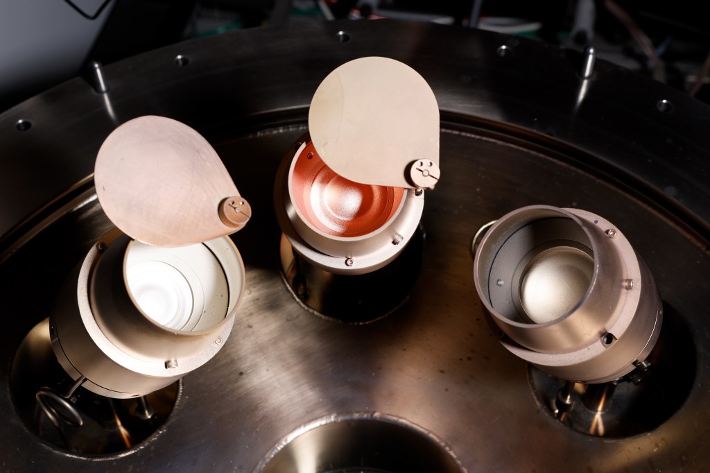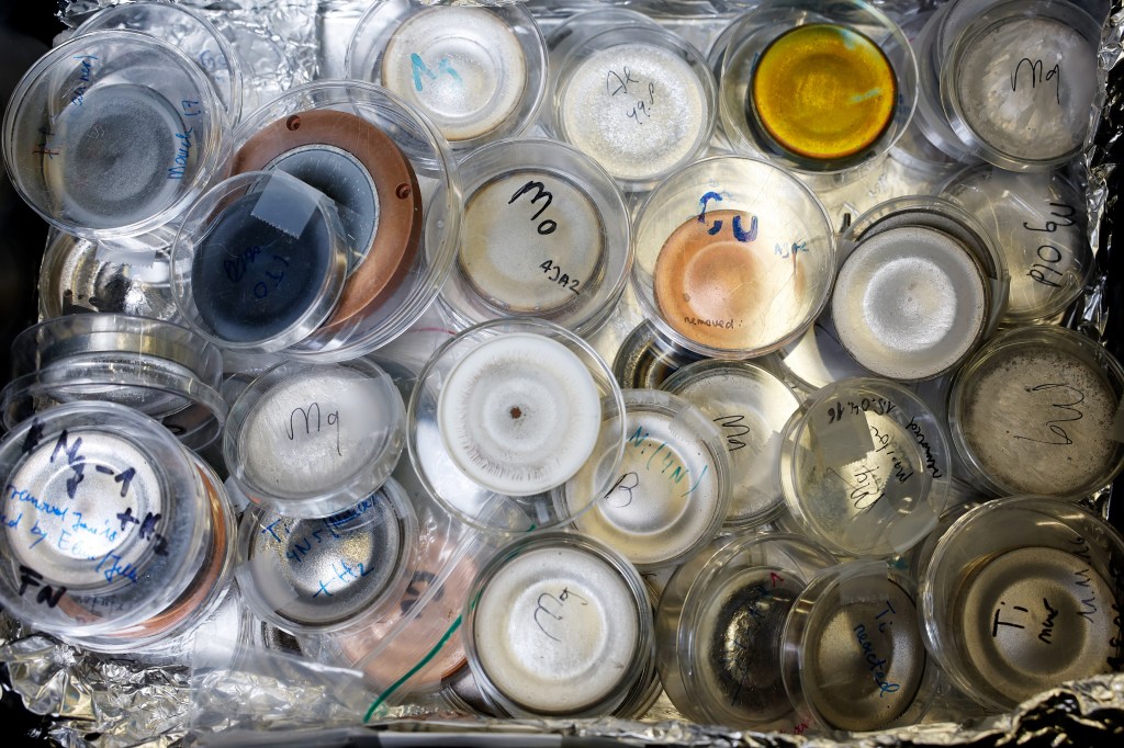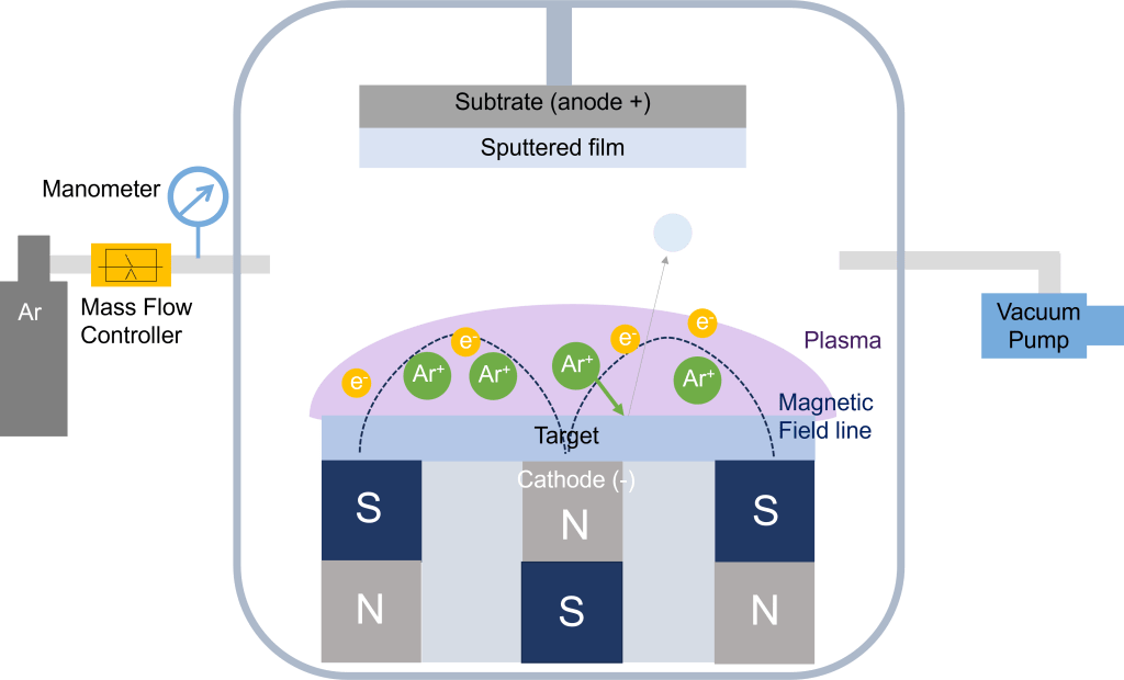 All our research starts with a good sample. Most of our samples are made using physical vapor deposition (PVD)/magnetron sputtering. A magnetron sputtering set-up consists of a big vacuum chamber in which disks of target materials are located. The samples (substrate or optical fibers) that are to be sputtered are located above these targets. During deposition a low pressure of an inert gas (‘sputtering gas’) is realized in the chamber to create a plasma. This plasma is created by applying a high voltage between the cathode (located behind the target) and the anode (the wall of the chamber/ground/substrate). This causes electrons present in the sputtering gas to be accelerated away from the target and collide with the molecules in the gas. As a result, electrons are knocked of the sputtering gas creating ions. Magnets ensure that the electrons are confined to the space just above the target ensuring a sufficiently high density plasma. As a result, the target is bombarded with high-energy ions, which causes atoms to be liberated from the target. These atoms can then travel to the surface that is to be sputtered to create a film. By controlling the sputtering time, gas pressure and the power applied during deposition highly controlled and reproducible depositions can be made. In addition, by simultaneously sputtering targets at well-defined powers one can create quite precise alloy compositions. As no solvents are used during deposition, it is a relatively environmentally benign method to deposit materials.